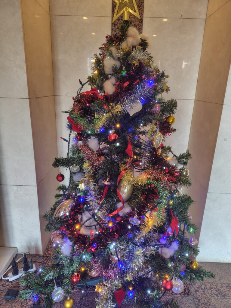 自宅マンションの入口にクリスマスツリーが飾られています。