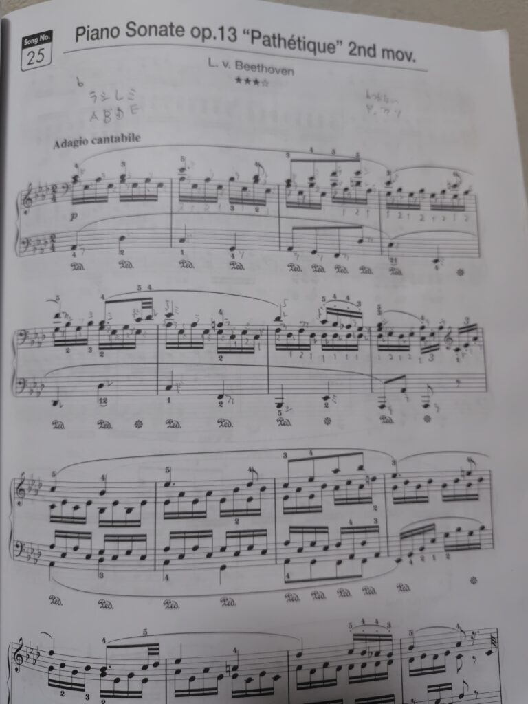 譜面を開けたら、最初から8小節は、右手も左手もヘ音記号から始まります。左手のヘ音記号は慣れていますが、右手のヘ音記号は中々ありません。そこで、ド・レ・ミの音階をオタマジャクシの横に書いて、下に指番号を書いてから練習しました。この8小節以降は、右手は、ト音記号で、左手はヘ音記号の通常の形なので後は、ド・ファ・ソ以外は、半音下げる事を肝に銘じて練習します。