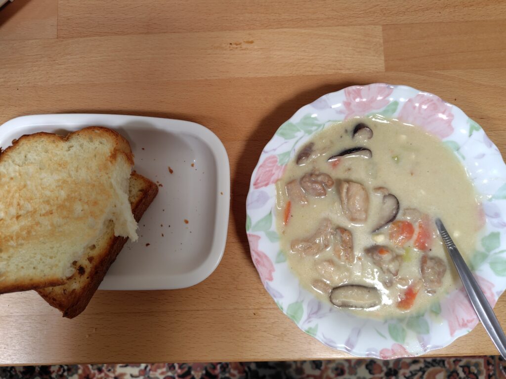 シチュー。今回は、市販のルーは使用せず、小麦粉、バター、牛乳、ワインで味付けしました。市販のルーで作るより、たんぱくで味がそれほど濃くなくて、美味しいです。