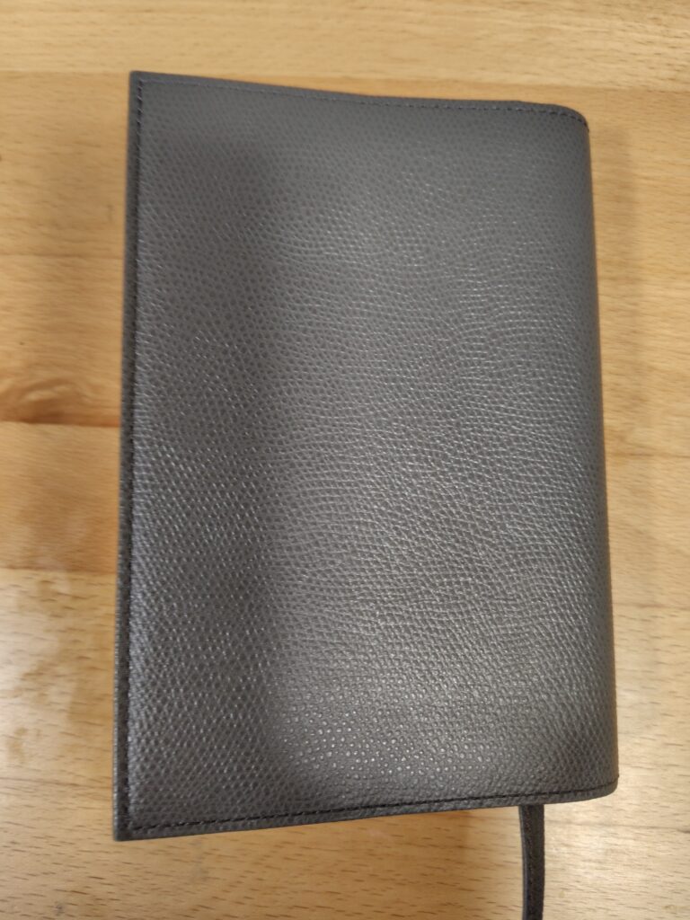 知人から昨年、私の誕生日プレゼントでブックカバーをもらいました。地元図書館で借りた本にこのブックカバーを付けています。色も地味でとても気に入っています。