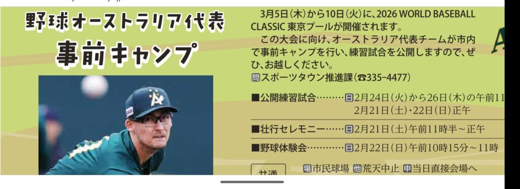 WBCオーストラリア代表チームが今回も府中市でキャンプを行います。練習試合を見に、市民球場に行きます。
